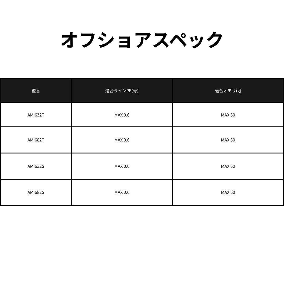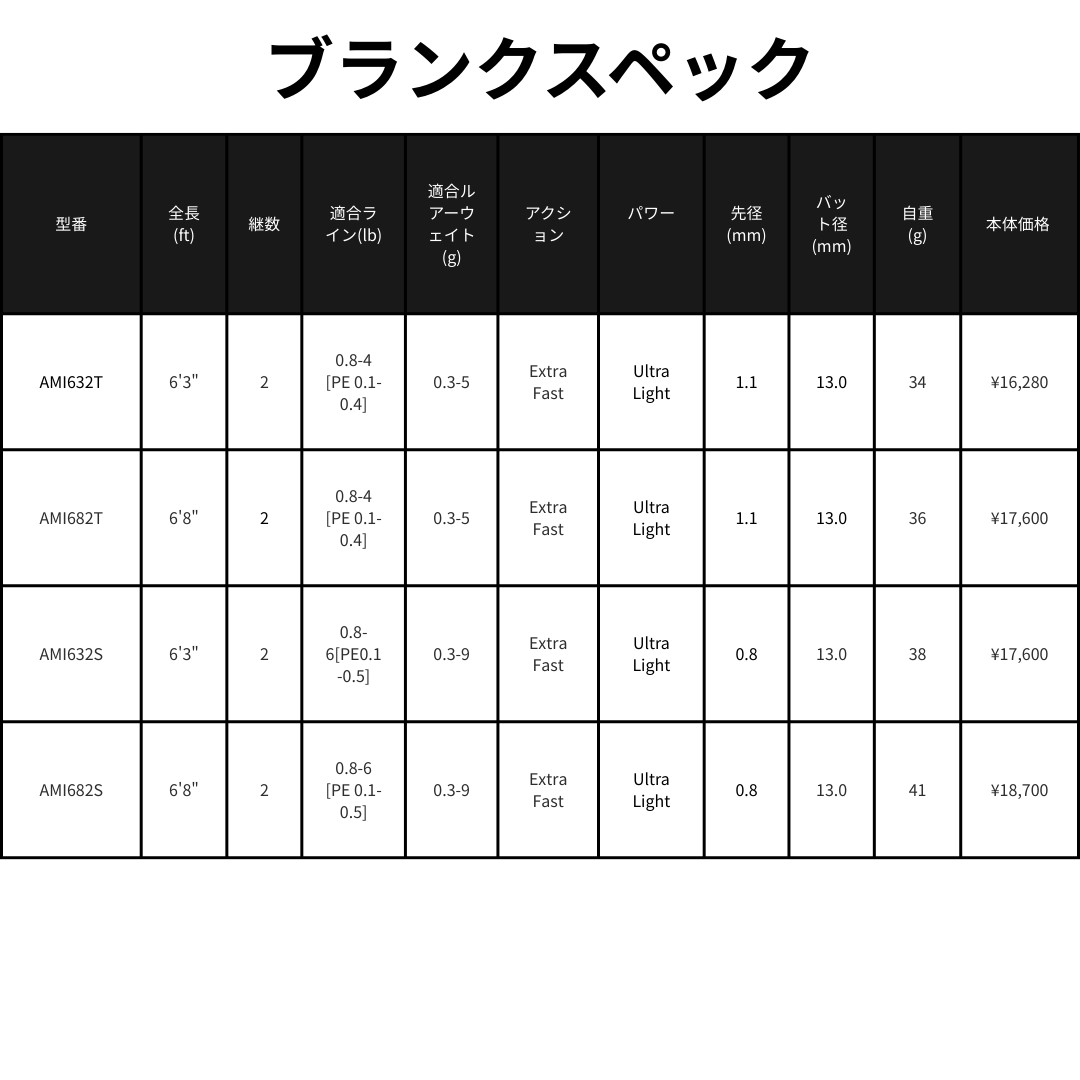| AMI682T | 6'8" | 2 | 0.8-4 [PE 0.1-0.4] | 0.3-5 | Extra Fast | Ultra Light | 1.1 | 13.0 | 36 | Mat Black | ¥17,600 |