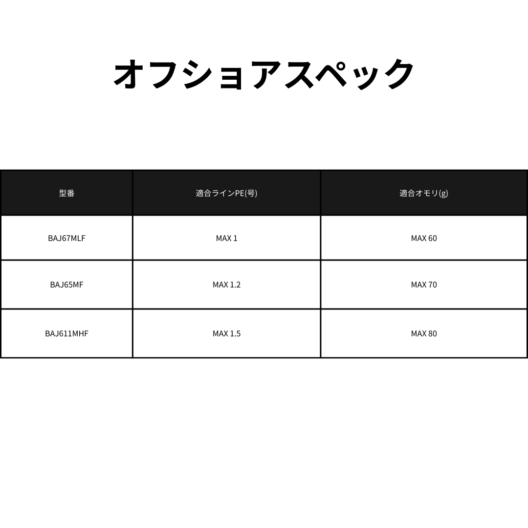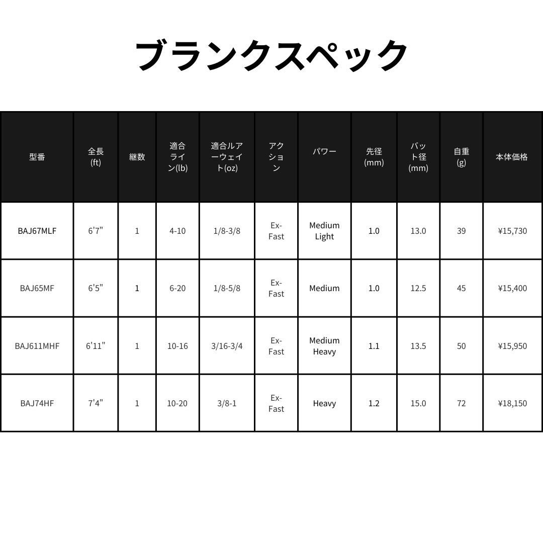 | BAJ611MHF | 6'11" | 1 | 10-16 | 3/16-3/4 | Ex-Fast | Medium Heavy | 1.1 | 13.5 | - | 50 | Mat Black | ¥15,950 |