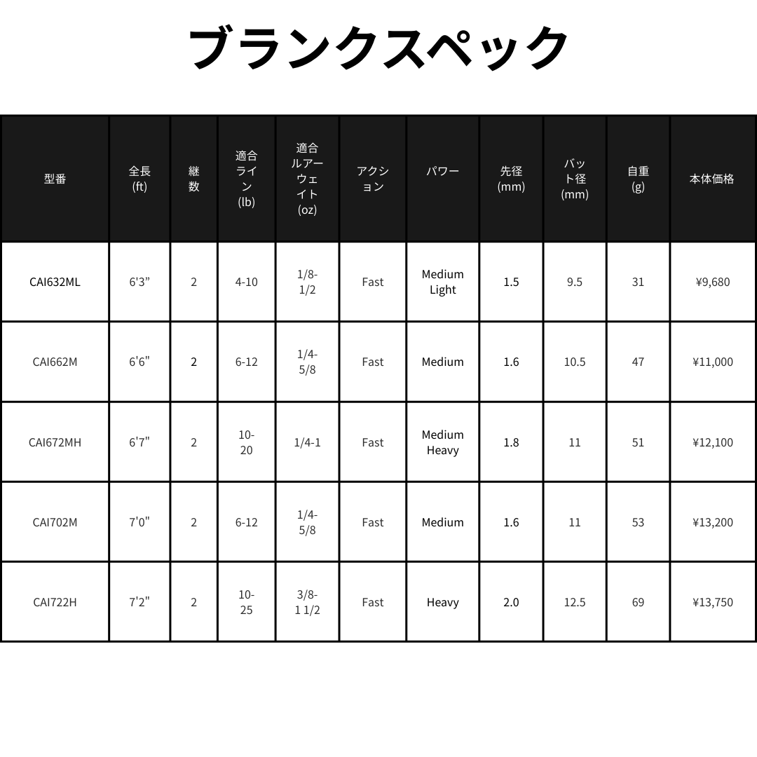 | CAI702M | 7'0" | 2 | 6-12 | 1/4-5/8 | Fast | Medium | 1.6 | 11.0 | 53 | Mat Black | ¥13,200 |