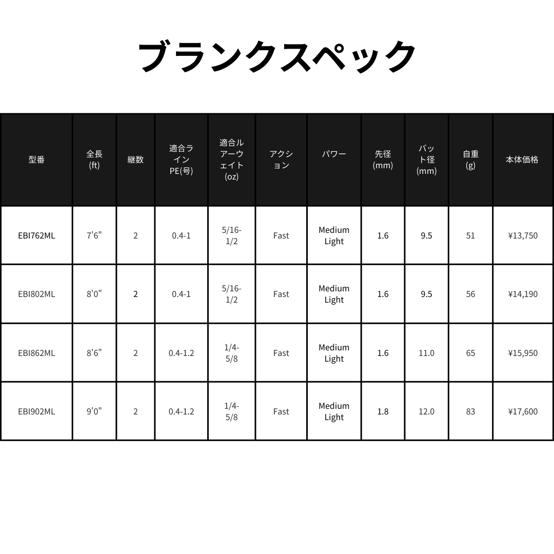 | EBI802ML | 8'0" | 2 | 0.4-1 | 5/16-1/2 | Fast | Medium Light | 1.6 | 9.5 | 56 | Mat Black | ¥14,190 |