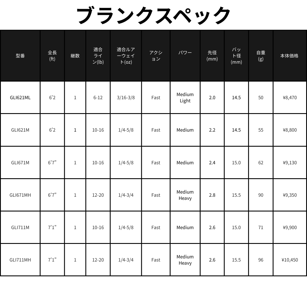 | GLI621M | 6'2" | 1 | 10-16 | 1/4-5/8 | Fast | Medium | 2.2 | 14.5 | 55 | Mat Black | ¥8,800 |