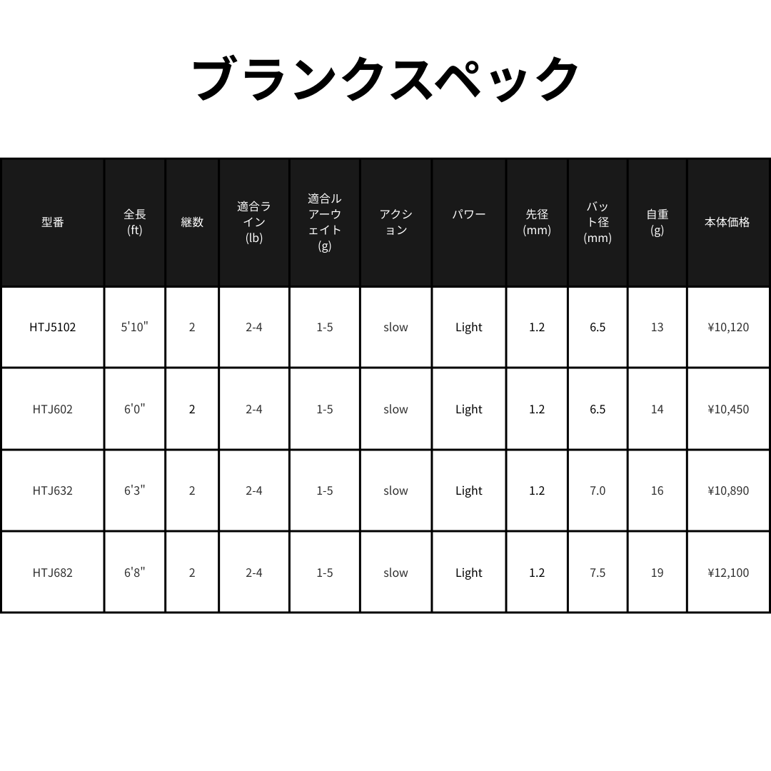 | HTJ602 | 6'0" | 2 | 2-4 | 1-5 | slow | Light | 1.2 | 6.5 | 14 | Mat Black | ¥10,450 |