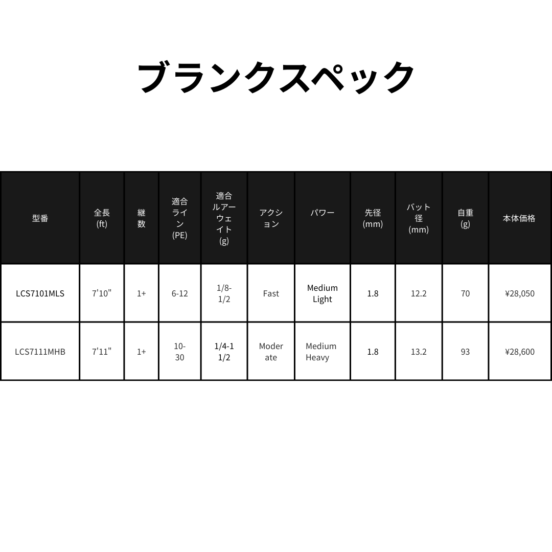 | LCS7111MHB | 7'11" | 1+ | 10-30 | 1/4-1 1/2 | Moderate | Medium Heavy | 1.8 | 13.2 | 600 | 93 | Clear | ¥28,600 |