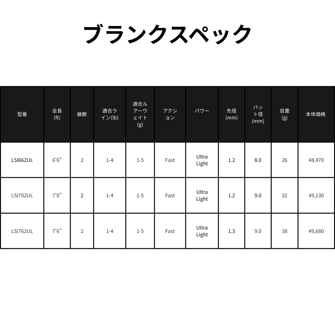 | LSI662UL | 6'6" | 2 | 1-4 | 1-5 | Fast | Ultra Light | 1.2 | 8.0 | 26 | Mat Black | ¥8,470 |