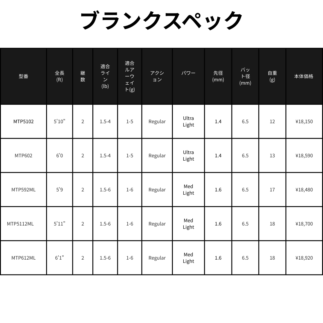 | MTP612ML | 6'1" | 2 | 1.5-6 | 1-6 | Regular | Med Light | 1.6 | 6.5 | 18 | Clear | ¥18,920 |
