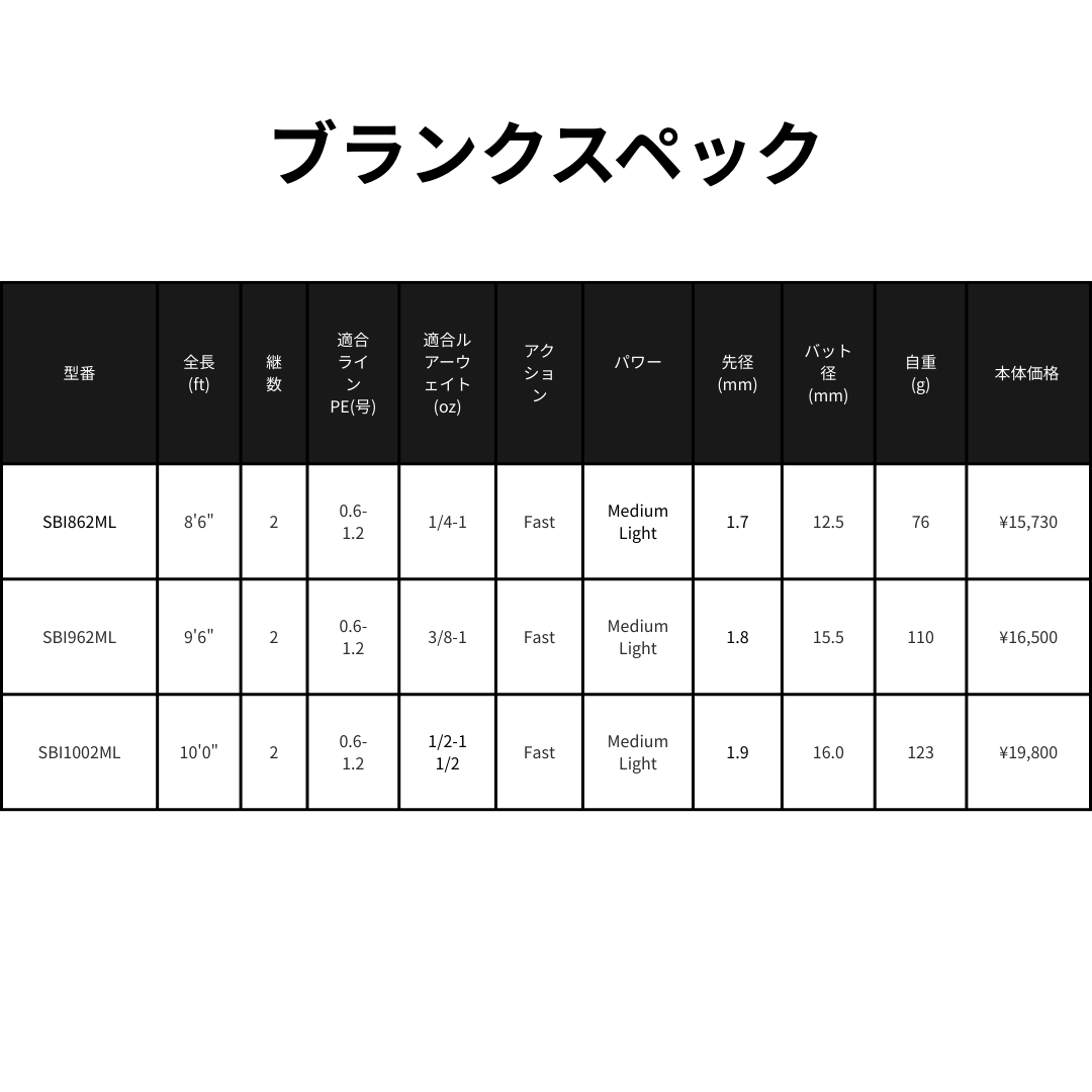 | SBI862ML | 8'6" | 2 | 0.6-1.2 | 1/4-1 | Fast | Medium Light | 1.7 | 12.5 | 76 | Mat Black | ¥15,730 |