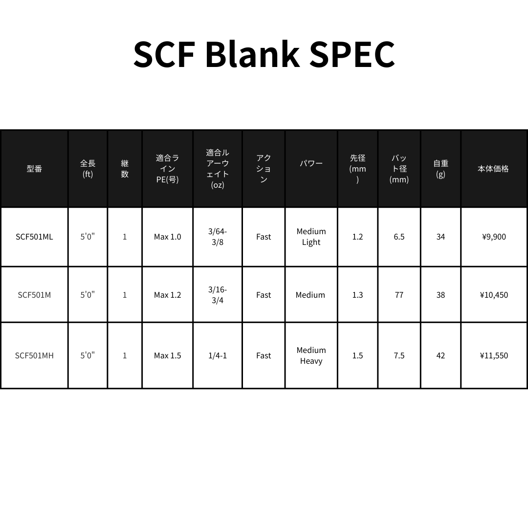 | SCF501ML | 5'0" | 1 | Max 1.0 | 3/64-3/8 | Fast | Medium Light | 1.2 | 6.5 | 34 | ¥9,900 |