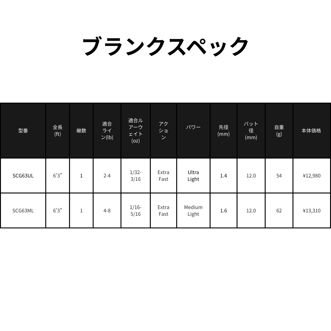 | SCG63UL | 6'3" | 1 | 2-4 | 1/32-3/16 | Extra Fast | Ultra Light | 1.4 | 12.0 | 275 | 54 | Mat Black | ¥12,980 |