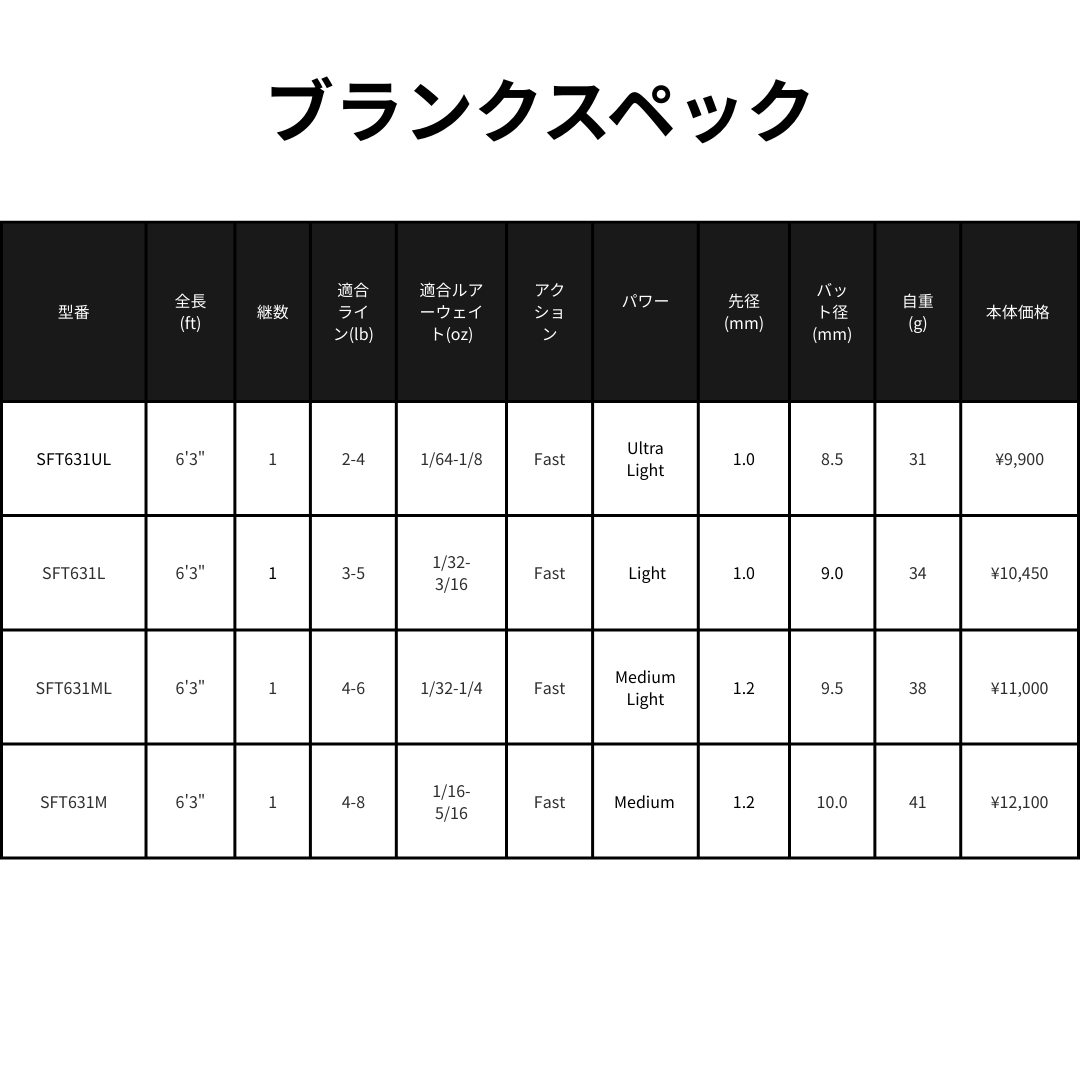 | SFT631UL | 6'3" | 1 | 2-4 | 1/64-1/8 | Fast | Ultra Light | 1.0 | 8.5 | 335 | 31 | Mat Black | ¥9,900 |