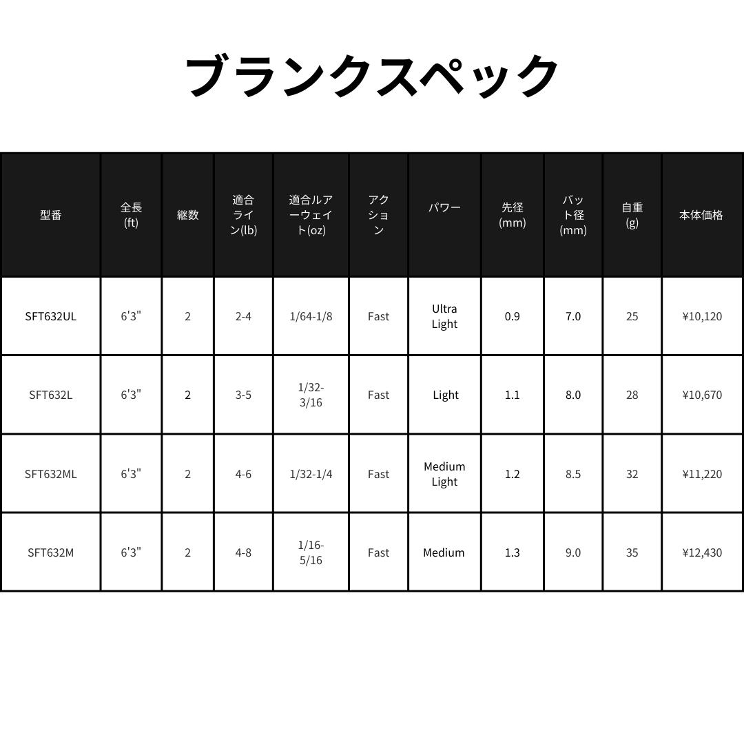| SFT63UL | 6'3" | 2 | 2-4 | 1/64-1/8 | Fast | Ultra Light | 0.9 | 7.0 | 25 | Mat Black | ¥10,120 |