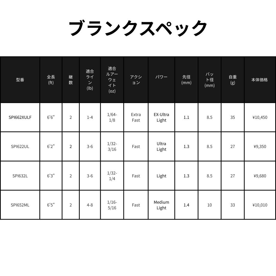 | SPI662XULF | 6'6" | 2 | 1-4 | 1/64-1/8 | Fast | EX-Ultra Light | 1.1 | 8.5 | 35 | Mat Black | ¥10,450 |