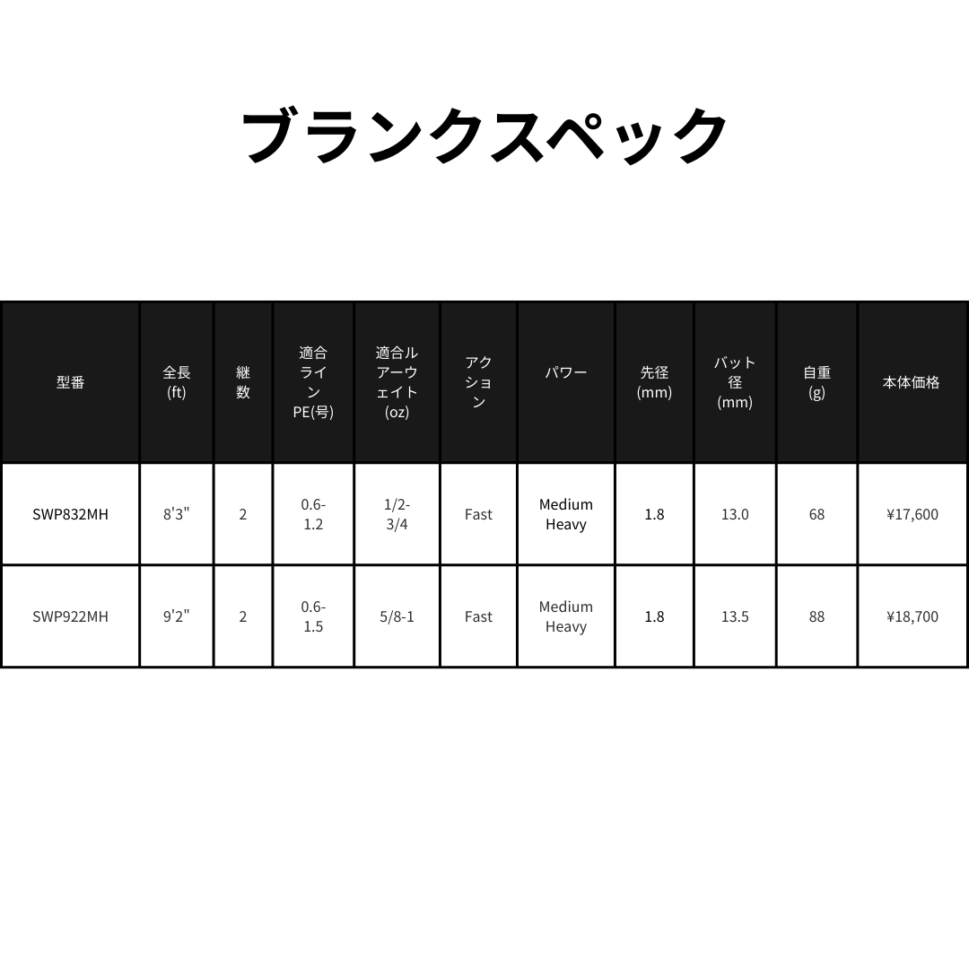 | SWP832MH | 8'3" | 2 | 0.6-1.2 | 1/2-3/4 | Fast | Medium Heavy | 1.8 | 13.0 | 68 | Mat Black | ¥17,600 |